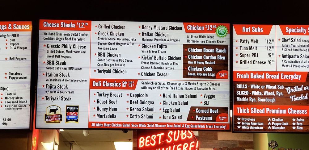 Add up to three meats to create your own masterpiece. "The Works" includes Kraft Real Mayo, French's Yellow Mustard, lettuce, tomatoes, pickles, onions, salt, pepper, oil and vinegar on the side!